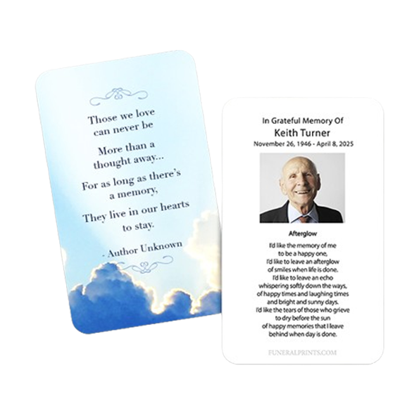 Our premium memorial prayer cards are available with upgraded paper and finish options such as pearlescent shimmer cardstock, velvet soft-touch lamination, or extra-thick stock for a distinguished feel. These enhancements create a keepsake guests will treasure long after the service.