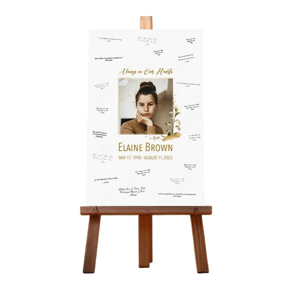 A funeral memory board encourages guests to sign their names and share brief, personal memories. What sets this board apart from traditional book is the option of framing it and incorporating it into your home’s decor, where it will always be visible and a wonderful reminder of a life well lived. A memory board for funeral use is fully customizable with options such as gold glitter lettering or an attractive floral border.