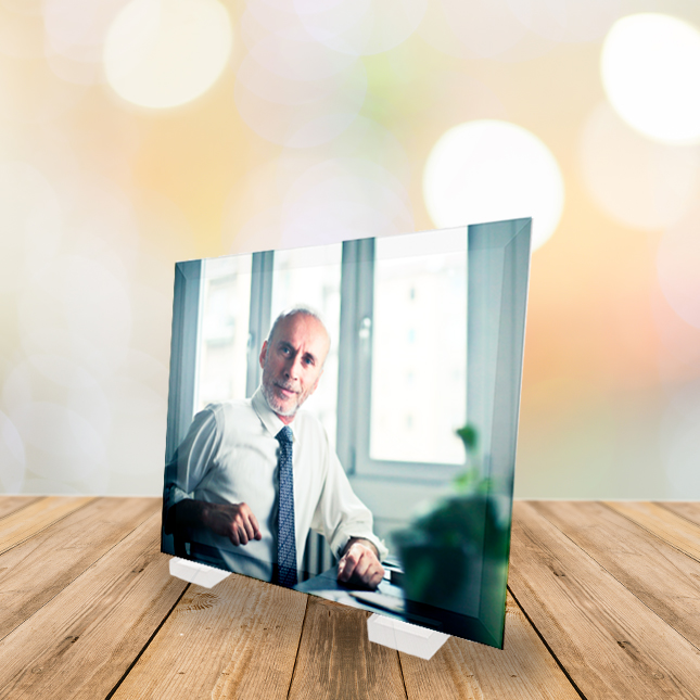 Crafted with sparkling glass and 1/2" highly polished beveled edges, these photo prints reflect light beautifully, casting a spectrum of prismatic colors when displayed in direct light. Each Flat Glass comes complete with a sleek stand, making it easy to display your cherished memory anywhere.