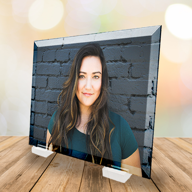 Crafted with sparkling glass and 1/2" highly polished beveled edges, these 8"x10" photo prints reflect light beautifully, casting a spectrum of prismatic colors when displayed in direct light. Each Flat Glass comes complete with a sleek stand, making it easy to display your cherished memory anywhere.