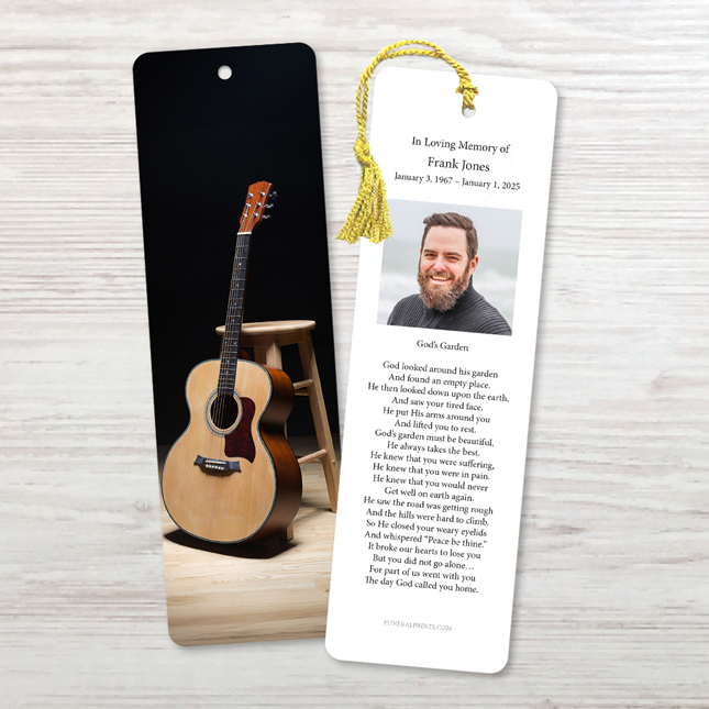 The Guitar Bookmark showcases a striking guitar design, symbolizing passion, creativity, and the joy of music. This heartfelt tribute is a meaningful way to honor the memory of a loved one who shared their love of music with the world. Personalize the bookmark with a cherished photo, name, and a heartfelt message for a lasting remembrance.