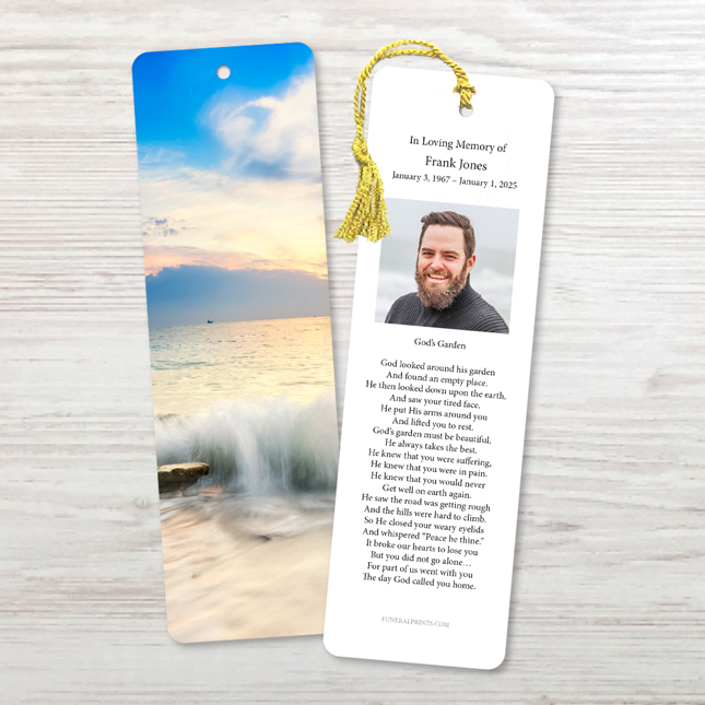 The Morning Ocean Bookmark showcases a serene ocean sunrise, symbolizing renewal, peace, and the promise of a new day. This calming design offers a comforting tribute, making it a meaningful way to honor the memory of a loved one. Personalize the bookmark with a cherished photo, name, and a heartfelt message for a lasting remembrance.