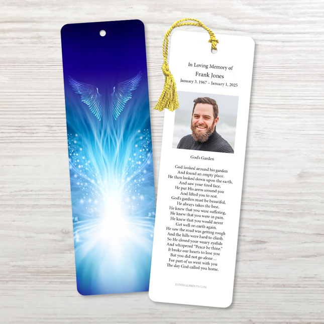 The Angel Wings Bookmark features a beautiful design of angel wings, symbolizing protection, guidance, and the eternal presence of a loved one. This serene tribute provides comfort and hope, making it a meaningful way to honor and remember someone special. Personalize the bookmark with a cherished photo, name, and a heartfelt message for a lasting remembrance.