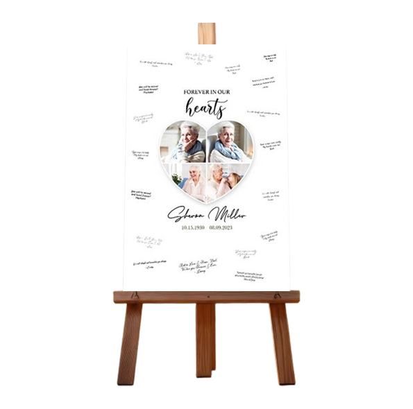 A funeral memory board encourages guests to sign their names and share brief, personal memories. What sets this board apart from traditional book is the option of framing it and incorporating it into your home’s decor, where it will always be visible and a wonderful reminder of a life well lived. A memory board for funeral use is fully customizable with options such as gold glitter lettering or an attractive floral border.