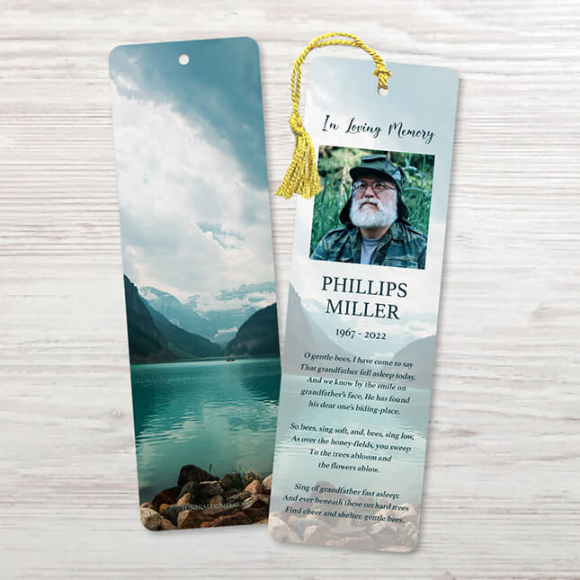 We are honored to help you celebrate the life of your loved one. Beautiful custom printed bookmarks print & ship the same day Mon - Fri when ordered by 3PM EST. These hand crafted keepsakes are laminated & include tassels. Each order is personalized with your photo & prayer choice. Our memorial bookmark designers are eager to help you tell the story of your loved one. Connect with our team  1-930-900-2219  8am - 10pm EST, 7 days a week.