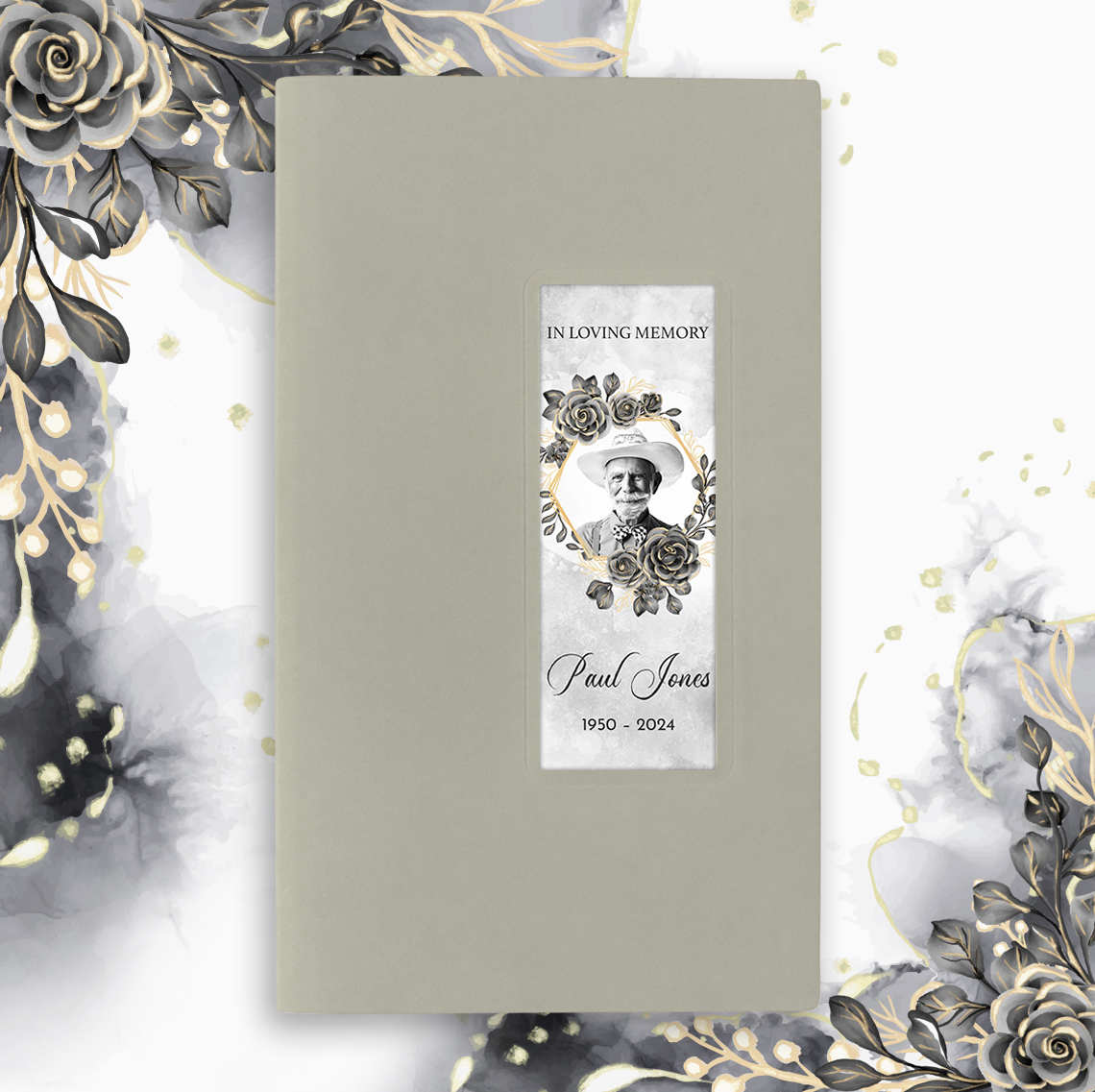 The Black Gold Floral Guest Book offers a dignified and meaningful way to capture the condolences and memories shared by attendees at a funeral or memorial service. With its sleek gray cover, this guest book exudes an understated elegance, providing a respectful space for guests to express their sympathies and share their thoughts.