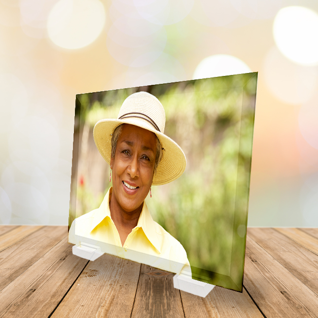 Crafted with sparkling glass and 1/2" highly polished beveled edges, these 5"x7" photo prints reflect light beautifully, casting a spectrum of prismatic colors when displayed in direct light. Each Flat Glass comes complete with a sleek stand, making it easy to display your cherished memory anywhere.