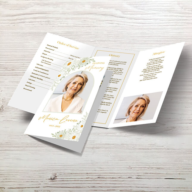 This coordinated memorial package includes personalized programs, prayer cards, bookmarks, and a memorial poster, making it ideal for funeral services, celebration of life gatherings, or as obituary keepsakes. Each piece can be fully customized with photos, names, and personal messages, allowing you to create a heartfelt and lasting tribute that beautifully reflects the memory of your loved one.