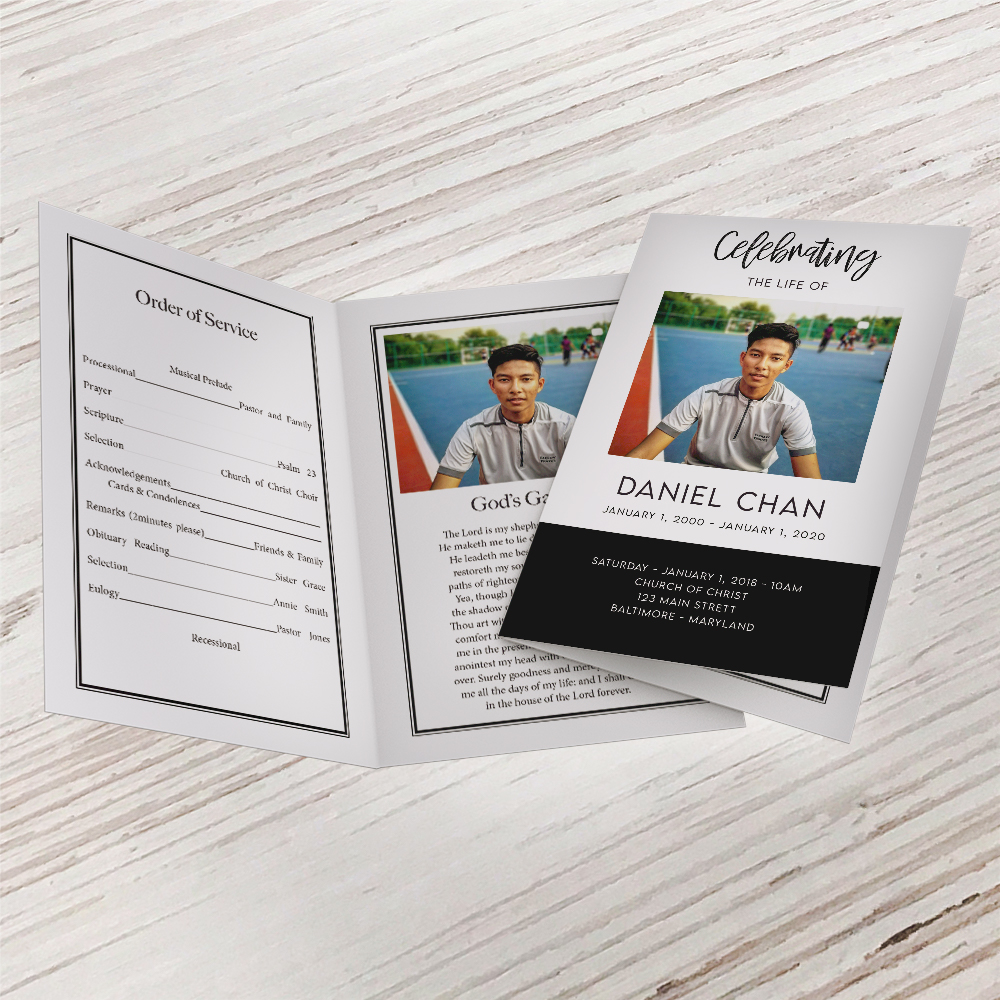 Create your programs with ease on our simple design platform! Or give us a call and one of our team members would be happy to design it for you for a design fee of $40.00. Simply provide the content and requested layout, and our designers will take care of the rest! All proofs are sent and confirmed via email.